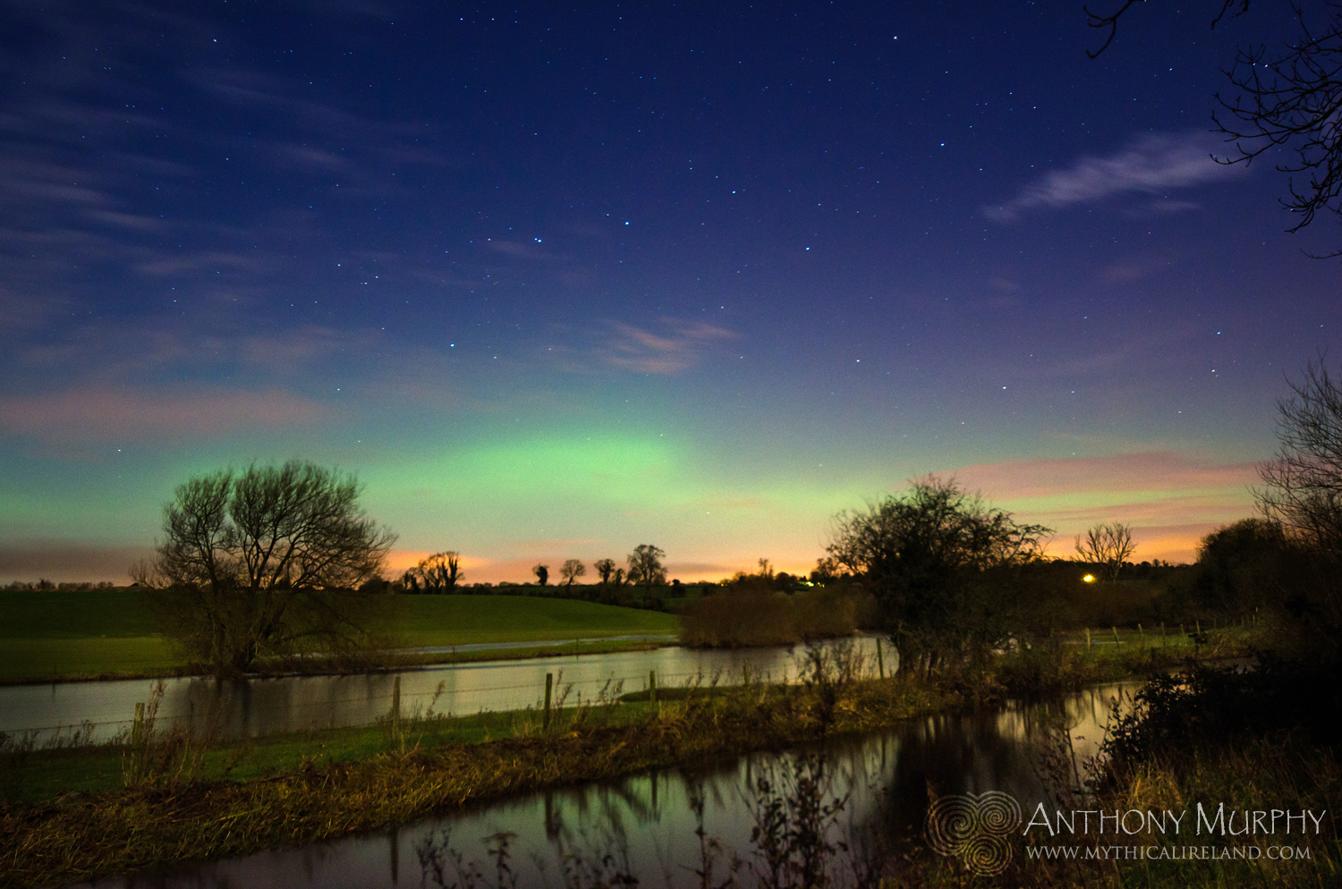 | Emerald Isle . . . green aurora with the Plough over the Boyne river and canal at Newgrange tonight. |