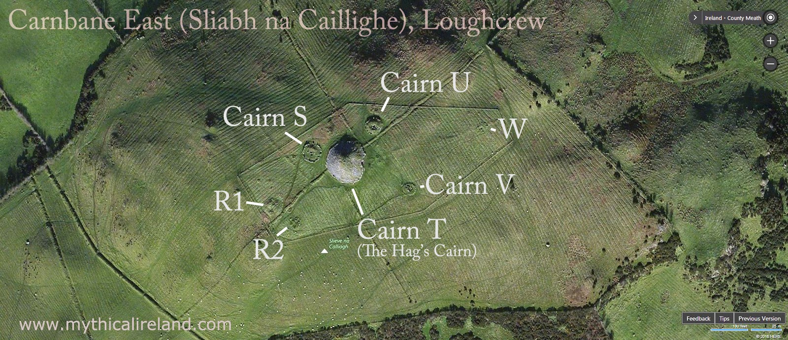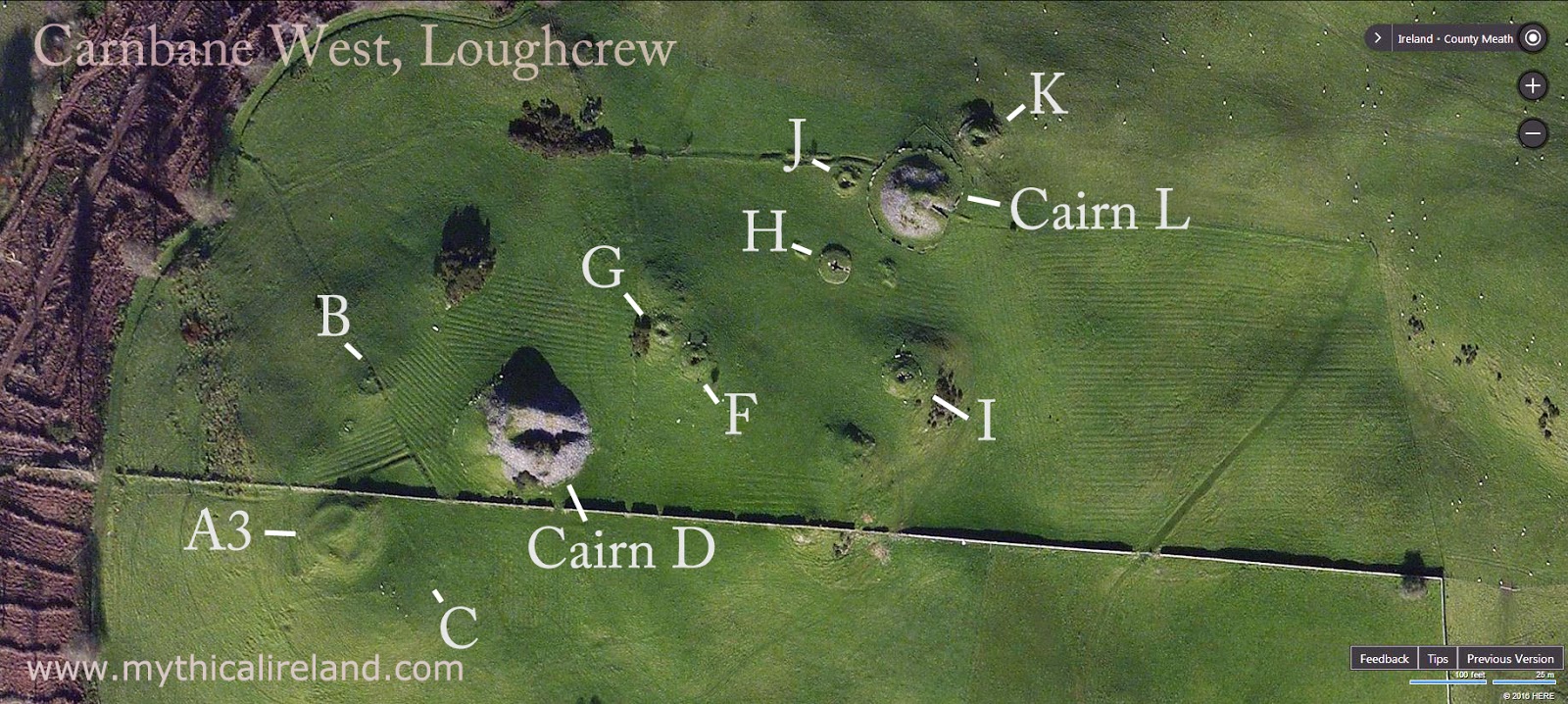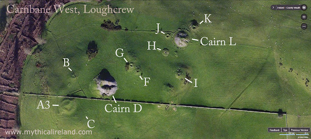 I've created maps of the cairns at Sliabh na Caillighe/Loughcrew, using Bing Maps. The cairns are believed to be older than Newgrange, dating possibly to 3500BC, and were given letter designations by Eugene Conwell, who excavated some of them in the 1860s. The hill known as Carnbane West today was, according to local folklore, known previously simply as Carnbane (from carn bán, the "white cairn"). The hill labelled Carnbane East today was known in the past as Sliabh na Caillighe, the Mountain of the Hag.