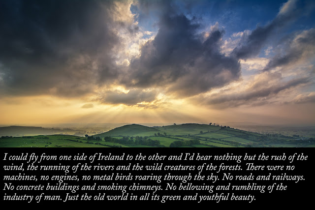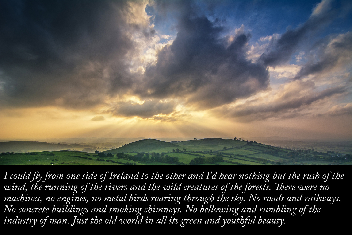 I could fly from one side of Ireland to the other and I’d hear nothing but the rush of the wind, the running of the rivers and the wild creatures of the forests. There were no machines, no engines, no metal birds roaring through the sky. No roads and railways. No concrete buildings and smoking chimneys. No bellowing and rumbling of the industry of man. Just the old world in all its green and youthful beauty. Oh how I long for those days to return.