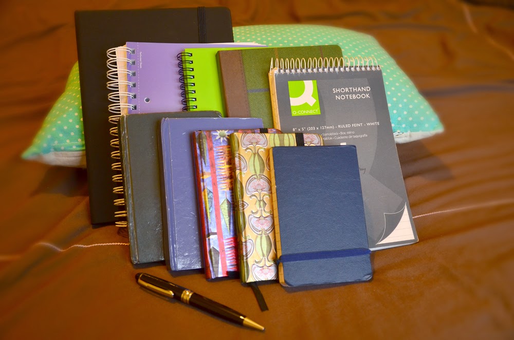 I've been more careful lately to select notebooks with a hard cover on them. For years I wrote on reporter's notebooks, those tall spiral notebooks with either 80 or 160 pages in them. But they get damaged over time. Since I started writing the novel last August, I've been buying hardback notebooks of different shapes and sizes and doing my best to keep up the habit of writing.